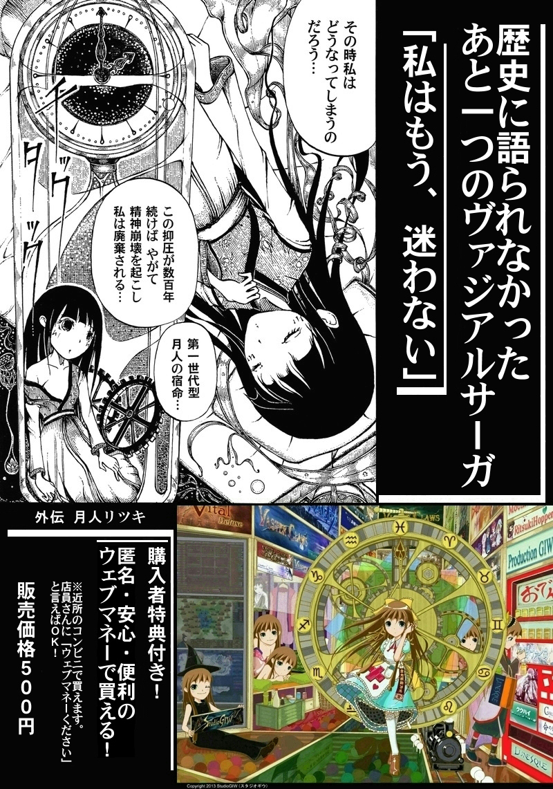 「コンテンツ情報」【 名称 】 VAZIAL SAGA 愚民化戦略 外伝 〜月人リツキ〜【 ジャンル 】 Webマンガ 【 年齢制限 】 15歳以上推奨 【 表示環境 】 IE等、通常のブラウザで表示 【 原作ゲーム 】 ヴァジアルサーガ〜愚民化戦略 Deluxe〜 ■コンテンツ詳細 ・マンガ本編:表紙+本編16ページ+あとがき ・特典イラスト:お礼絵1枚+カラーイラスト(3サイズ分) ・作者(高町菜葉)による本作品の解説書 ・マンガ本編の大画像版(1600x2282ピクセル)17枚 ・バナーの元サイズ版(1000x200ピクセル) ![]() 「マンガの購入方法」WebMoney又は、銀行振込みでご購入できます。購入金額 : 500円(税込) ご購入後、マンガ&特典イラスト&解説書などのデータをダウンロードできます。 ★WebMoneyでのご購入はこちらへ→ ★銀行振込みでのご購入は、こちらへ ”Webコミック一覧”の”Webマンガ「VS外伝・月人リツキ」”にチェックを入れ、 送金者名やメールアドレス等を記入し、送信してください。 「制作スタッフ」【 脚本・マンガ 】高町菜葉(たかまち なのは) 【 原作・監修 】 祇羽 (StudioGIW) |